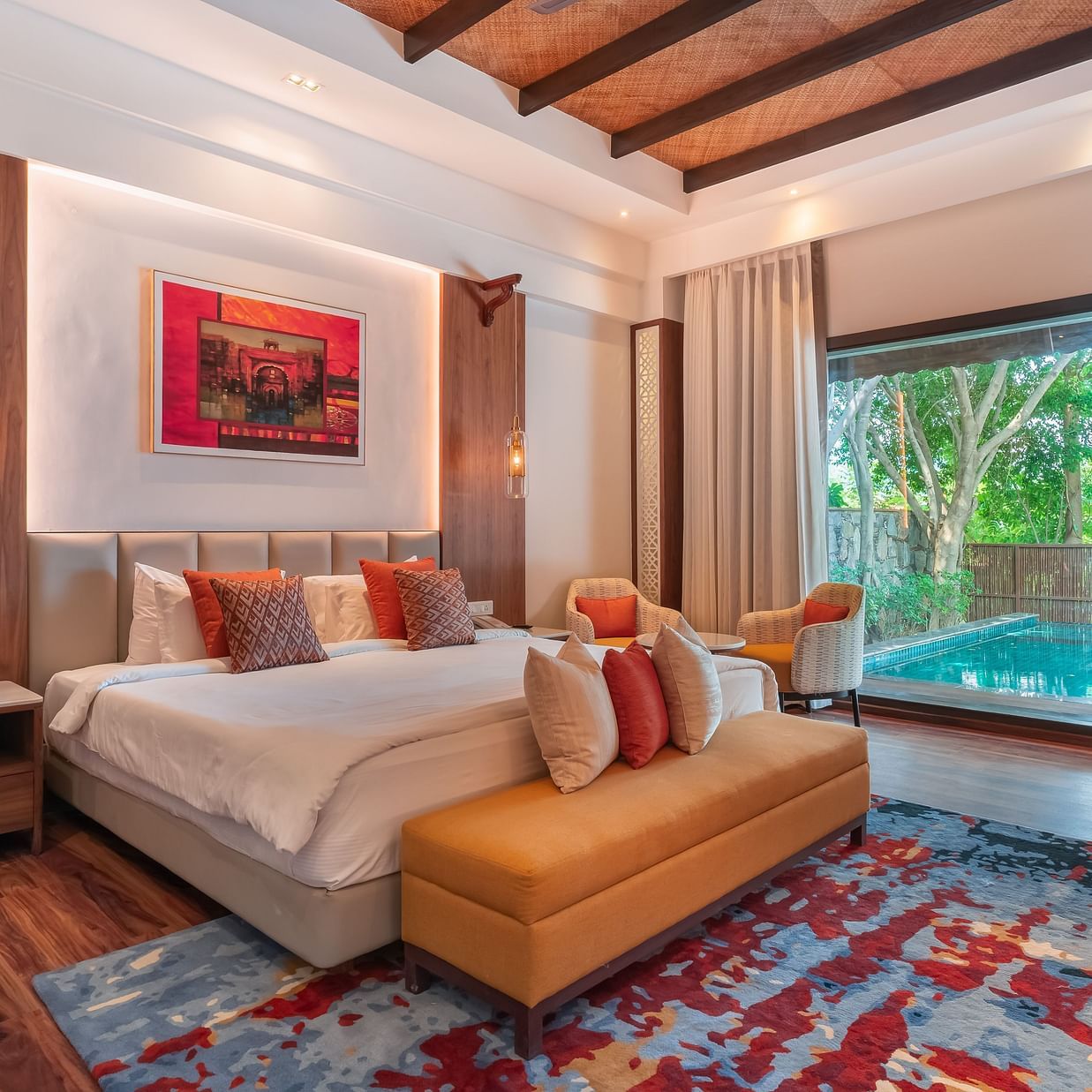 These villas in Udaipur are the most premium offering measuring 4500 sq. ft. at Ananta Udaipur. They feature 3 bedrooms with 2 double beds and a twin bed, attached to separate large living and dining spaces. With a private swimming pool and balcony, you will have the ultimate time relaxing here!