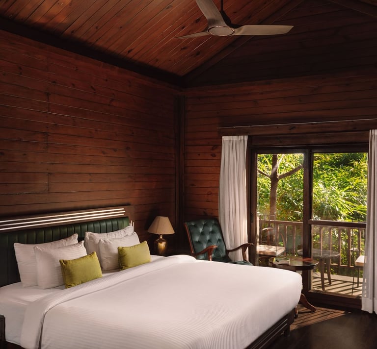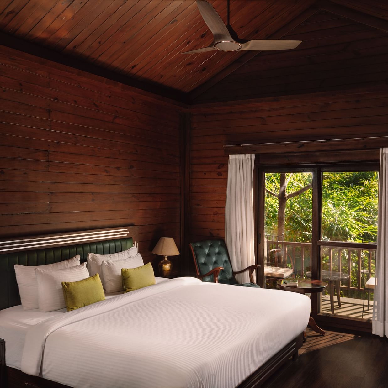 Our luxury resort in Udaipur houses 9 Wooden Cottages with balconies, each measuring 455 sq. ft. Guests can enjoy panoramic views from the private balcony and get personalised 24-hour services at our luxury cottage, Ananta Udaipur.