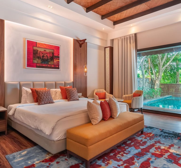 This villa is the most premium offering measuring 4500 sq. ft. at Ananta Udaipur. It features 3 bedrooms with 2 double beds and a twin bed, attached to separate large living and dining spaces. With a private swimming pool and balcony, you will have the ultimate time relaxing here!